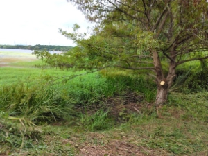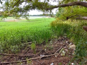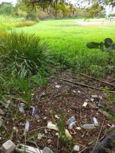 ワンド岸辺には、たくさんの漂着ごみがあります。